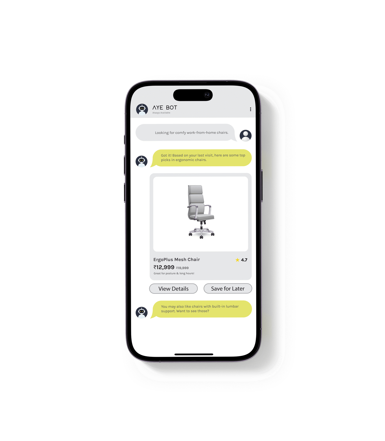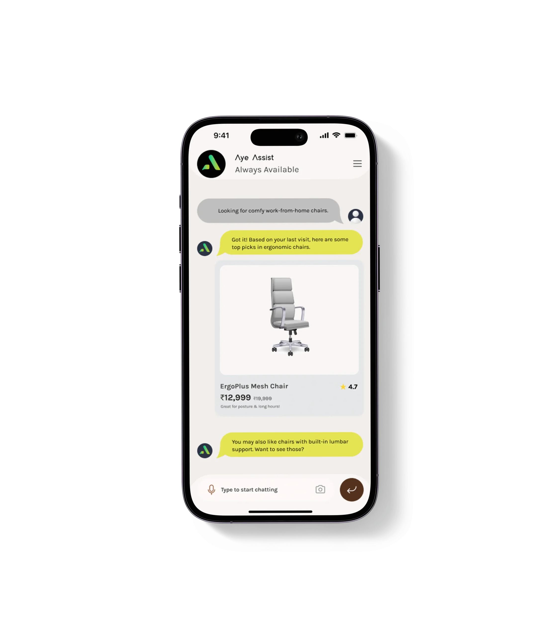 Aye Assist is an AI-powered chatbot that helps online shoppers compare, explore, and buy faster — while giving e-commerce brands a smarter way to engage, support, and convert.